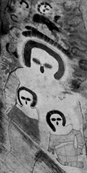 A imagem mais ‘popular’ chama-se Wandjina, mostra humanóides com uma larga faixa iluminada ao redor da cabeça e grandes olhos negros: