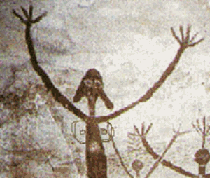 Este desenho, descoberto em Victoria, Austrália, mais parece um astronauta…vestindo: capacete, luvas, botas e uma roupa protetora do corpo: