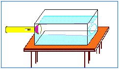 Coloque o aquário sobre uma mesa no centro da sala, de modo que você possa vê-lo de todos os lados. Preencha-o com água até 3/4 do seu nível total. Acenda a lanterna e mantenha-a encostada numa das paredes do aquário, ao longo de seu comprimento. Tente observar o feixe de luz que se propaga pela água.