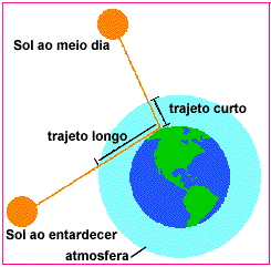 Ao pôr-do-sol ou ao amanhecer, a luz solar que nós observamos percorreu um caminho bem mais longo através da atmosfera terrestre que a luz solar que nós vemos ao meio-dia. Nesse longo trajeto muitas cores foram difundidas (e portanto retiradas do feixe de luz branca), sobrando para nossos olhos parte do amarelo e luz vermelha. E é o que vemos!