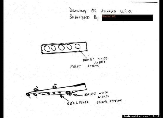 Um desenho feito por uma testemunha ocular de um avistamento de OVNI está em um dos 19 arquivos secretos postados para os britânicos no site do Arquivo Nacional. Os arquivos cobrem avistamentos relatados entre 1986 e 1992. Embora muitos dos relatórios já terem sido desmascaradas, alguns permanecem inexplicados.