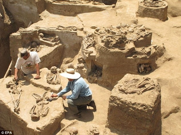 Eles também desenterraram restos de cães e cavalos no local, que fica ao lado de um centro cerimonial, 500 quilômetros ao norte de Lima.