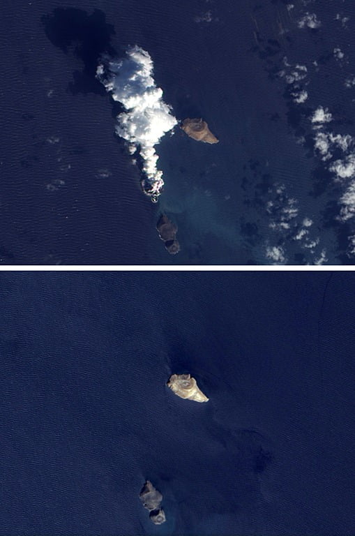Uma combinação de duas imagens do satélite Earth Observing-1 da agência espacial americana (Nasa) mostra atividade vulcânica no Mar Vermelho, com mais de uma erupção. No dia 23 de dezembro, apareceu uma nova ilha na região das Ilhas Zubair, conjunto de pequenas ilhas na costa oeste do Iêmen. A região faz parte da falha do Mar Vermelho, onde as placas tectônicas da Arábia e da África se separam e novas crostas oceânicas se formam regularmente.