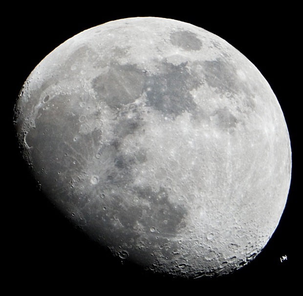 Na foto abaixo, a Estação Espacial Internacional (ISS) é vista como um pequeno objeto no canto inferior direito da foto, ao lado da Lua. Um fotógrafo da Nasa registrou a cena com uma câmera digital .