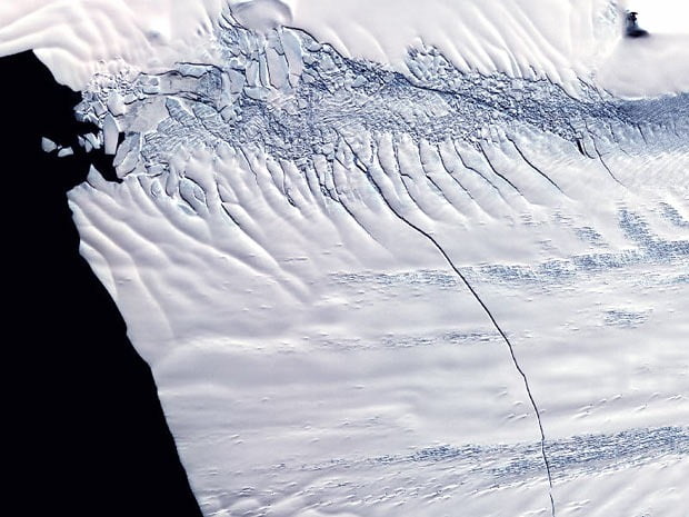 A fotografia mostra o bloco de gelo do alto, à distância. A rachadura, que tem 80 metros de espessura e 60 metros de profundidade, aparece na imagem como um risco. Já em novembro do ano passado, a Nasa havia divulgado uma foto mais próxima da rachadura.
