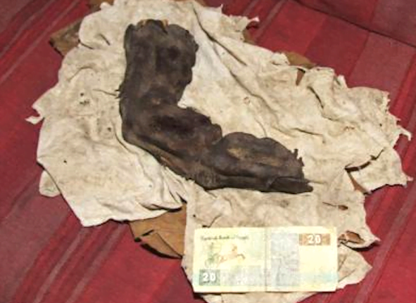 Enquanto é possível ver uma unha em uma das pontas, do outro lado parece ser o osso. O estado do material se encontra mumificado. Em alguns pontos, porém, se desintegrou.