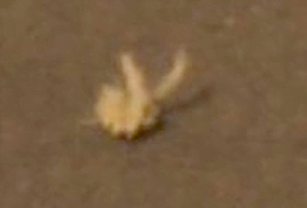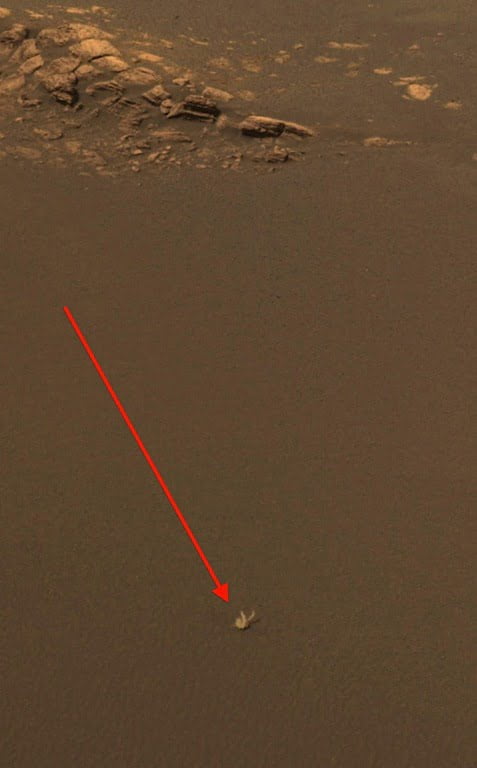 É um objeto amarelado medindo cerca de 4 a 5 centímetros de comprimento e fez sua estreia nos olhos da Opportunity ao dar as boas-vindas à Terra diretamente de um novo bairro em Marte registrado nos últimos dias em uma imagem panorâmica (veja a imagem original).