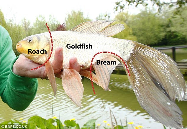 Mark Sawyer pescou mais do que ele esperava quando notou tipo muito raro e bizarro de peixe. Pesando pouco menos de 1kg, o estranho peixe é na verdade uma junção de três diferentes espécies de peixes com a cabeça de um leucisco, o corpo de um peixe dourado e da nadadeira traseira de um dourado.