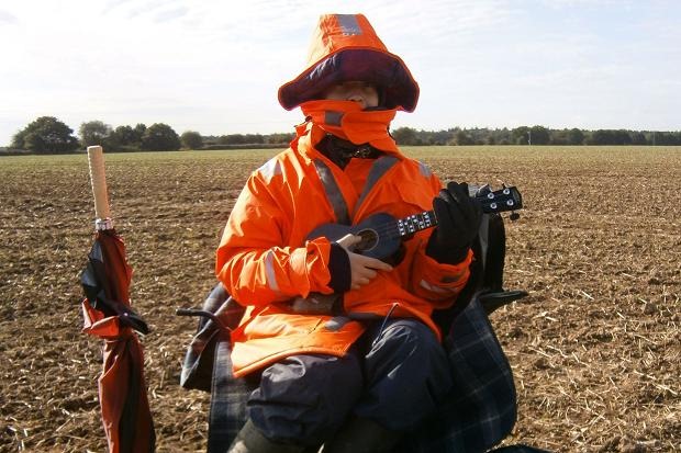 O garoto de 22 anos de idade, tem a tarefa de usar um casaco laranja e ficar sentado no campo faça chuva ou faça sol, enquanto soa um cowbell e toca um acordeão.