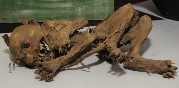 O suposto "chupacabra" tem ouvidos em forma de folha, narinas, patas com cinco dedos, cauda, boca aberta com mandíbula, presas longas e pequenas costelas.