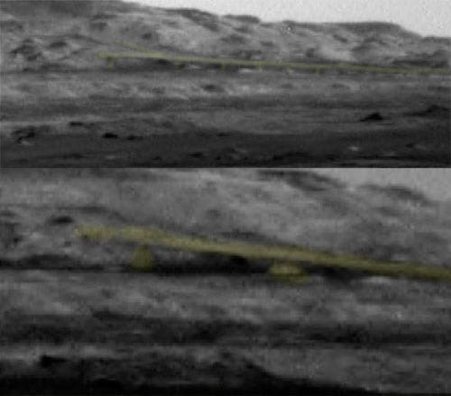 Esta é uma ampliação de uma foto tirada por uma das sondas de Marte. Na imagem há uma formação que se parece com uma estrada elevada ou ponte.