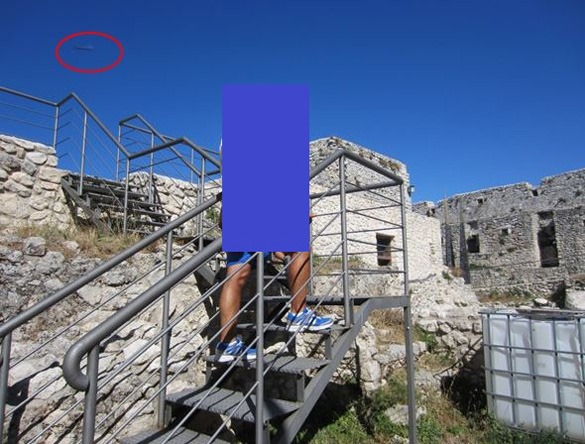“Esta foto foi tirada em 17/08/2013 às 16h00 em Monte Sant’Angelo, na província de Foggia, enquanto eu estava de férias. Estava com uma câmera digital compacta com uma resolução máxima (12.1 mega pixels). No momento do disparo, como mencionado, não vi nada de estranho. Percebemos o objeto estranho, repito, apenas em um momento posterior, quando baixamos as fotos”