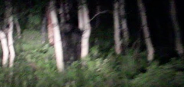 À medida que os faróis do carro iluminam as árvores, uma criatura bípede pode ser vista brevemente em pé entre os troncos. É difícil distinguir os detalhes na luz baixa, mas certamente parece que há algo lá.