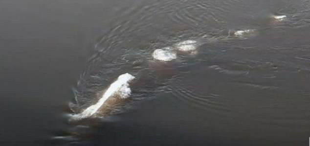 O ‘criatura’, que tinha cerca de 5 metros de comprimento, permaneceu semi-submersa no rio congelado durante todo o encontro e parecia ter uma quantidade surpreendente de gelo em suas costas.