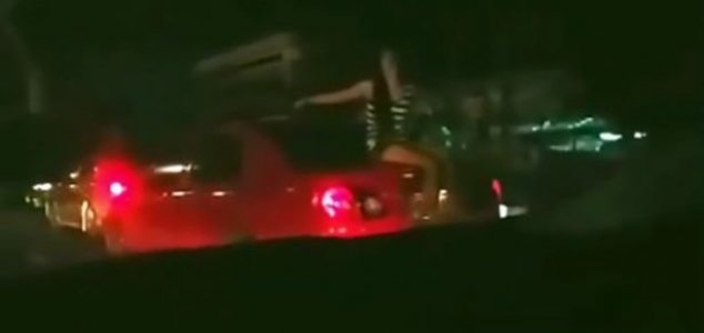 A filmagem peculiar, que foi gravada pelo fotojornalista Powarit Katkul na Tailândia, mostra um carro vermelho em uma estrada movimentada à noite e o que parece ser uma jovem sentada em cima dele com as pernas balançando.