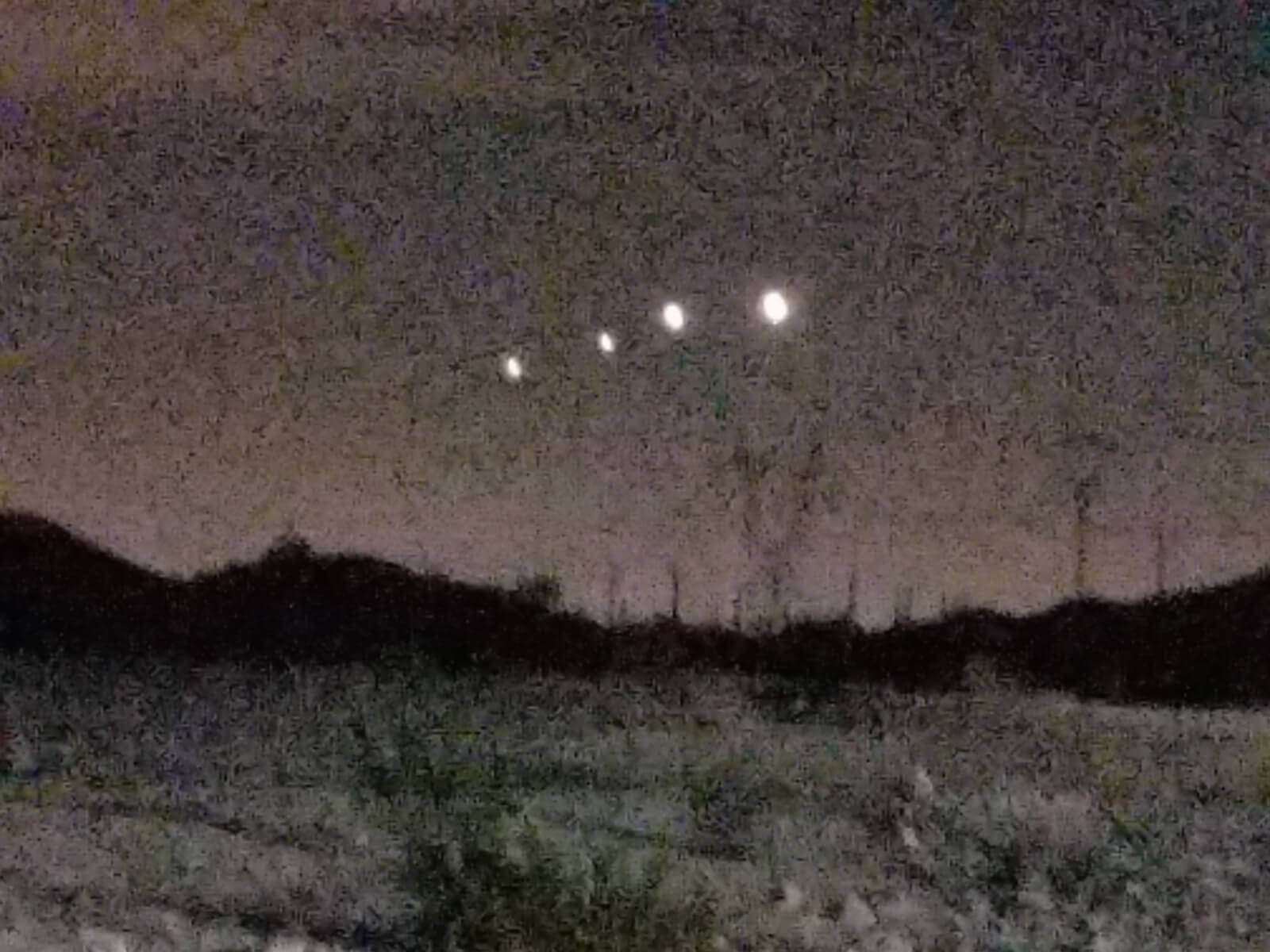 “Minha filha e eu estávamos dirigindo à noite quando notamos 4 luzes que pareciam muito brilhantes acima das montanhas. Quatro delas alinhados um ao lado do outro da direita para a esquerda. Eles permaneceram estacionários por alguns momentos então uma voou rapidamente para longe das outras 3 formando uma linha horizontal linear antes de desaparecer. Também vimos um avião distante, mas parecia estar mais longe e mais alto do que as luzes piscando. Os UFOs que vimos eram sólidos e de um branco brilhante amarelado destacando no céu noturno. Eles voavam com fluidez e se moviam em grandes distancias pelo céu em um instante, desaparecendo e reaparecendo. Eles eram muito maiores do que estrelas no céu e mais brilhantes do que a estrela mais brilhante. Nós sentimos que poderíamos fazer boas fotos e vídeos. Já os vimos antes no céu escuro da noite sobre as montanhas de Estrella, ao leste. Eles são comuns nesta parte de Goodyear. Nós os vemos várias vezes por ano.”
