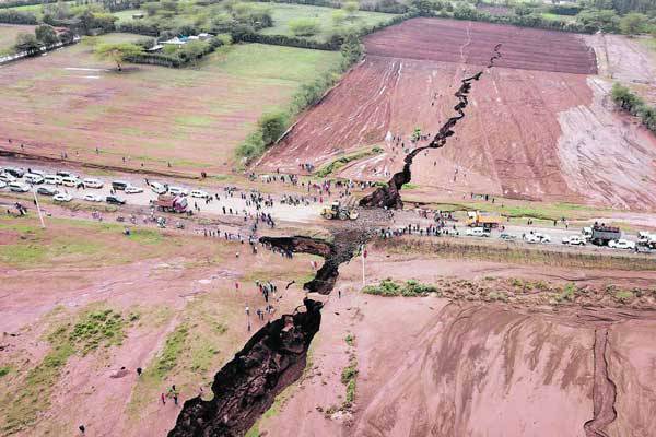 O crack, que foi inaugurado no Vale do Rift, no Quênia, após fortes chuvas e atividade sísmica no mês passado, mede cerca de 5 metros de largura, 15 metros de profundidade e tem vários quilômetros de extensão.