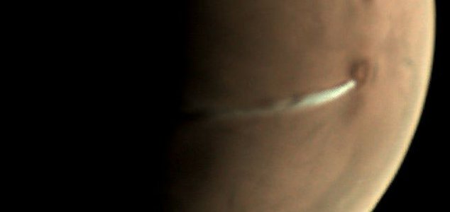 O satélite da ESA, o Mars Express, fotografou uma longa nuvem branca que se prolonga misteriosamente sobre a superfície do planeta.
