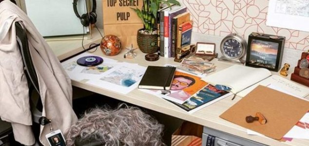Com a legenda “I spy with my little eye …”, a foto mostra uma mesa de escritório cheia de itens como uma peruca cinza, um crachá de identificação, vários livros, um par de fones de ouvido e um relógio.